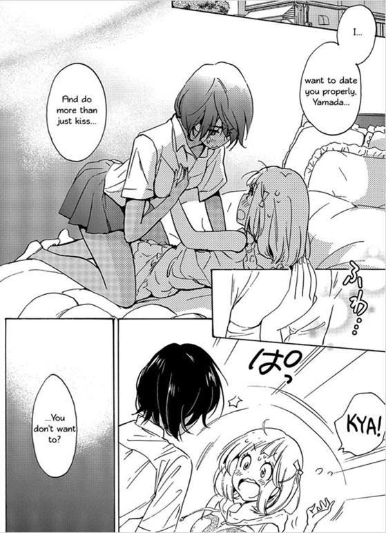 As one of the main characters of the story, the drastic difference between their sexual maturity felt inauthentic. The story shows them overcoming a lot of other relationship hurdles and I absolutely believe it is true to Kase’s character to be patient and not pushy. I don’t believe, however, that if Yamada had asked Kase to actually explain what she meant that Kase wouldn’t have been able to. There is a scene (pictured above from volume three) where Kase is about to show Yamada what she means, but then they are interrupted and it isn’t brought up again through the end of volume four. I know eventually they figure it out (thanks internet spoilers), but as of volume four in the series, Kase and Yamada have yet to figure out their relationship past kissing and the occasional over the clothing touches without there being believable interruptions to keep them apart in most instances. It simply goes back to sexual maturity disparity between the two.