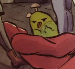 Image description: a green spirit with two mushrooms on their head glaring, sticking their tongue out, and what looks like giving the middle finger to an unconscious individual in a red robe.